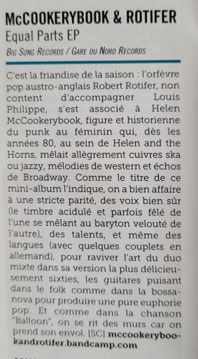 “It’s the treat of the season: the Austro-Anglo pop goldsmith Robert Rotifer, not content to accompany Louis Philippe, joined forces with Helen McCookerybook, figure and historian of female punk who from the 1980s within Helen and the Horns, blithely mingled ska or jazzy brass, western melodies and Broadway echoes. As the title of this mini-album indicates, we of course (the tangy and sometimes cracked timbre of one mingles with the velvety baritone of the other), talents, and even languages (with a few verses in German), for the art of the mixed duo in its most delightfully sixties version, the guitars drawing on folk as well as bossanova to produce pure pop euphoria. And like in the song ‘Balloon’, we laugh at the walls because we take flight. [SC] mccookerybookandrotifer.bandcamp.com”