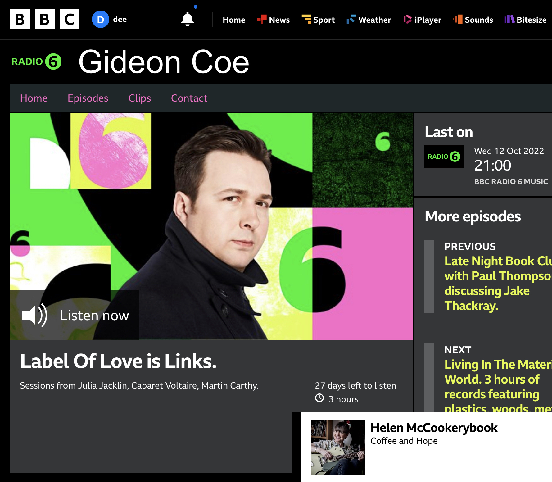 Gideon Coe played Coffee and Hope on his BBC Radio 6 Music show, Label Of Love is Links, on the 11th October 2022.